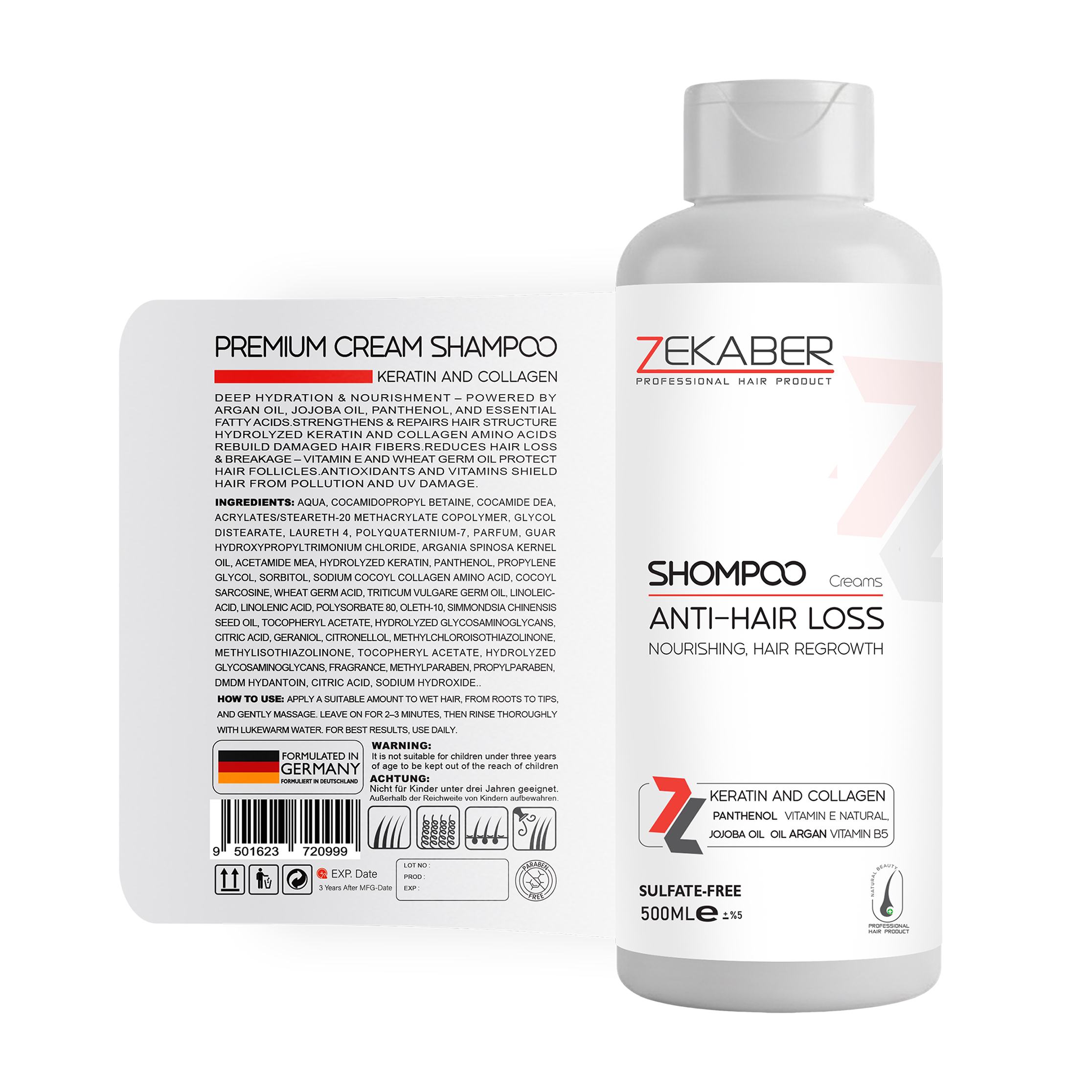 شامپو کرمی ضد ریزش مو زکابر مدل کراتین و فری سولفات احیا و تقویت تار مو حجم 500 میلی لیتر